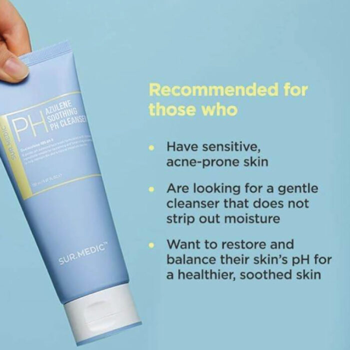 The SUR.MEDIC+ Azulene Soothing pH Cleanser is designed to cater to sensitive, irritated, and dry skin types. Its gentle formula makes it suitable for anyone looking for a soothing yet effective cleansing experience.